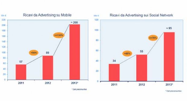 Il passaggio dalla vecchia alla nuova internet è quasi completato: a fine 2013 gli utenti che accedono ad internet mensilmente da smartphone sono circa il 90% di quelli che navigano da PC, così come quasi il 90% degli utenti internet visitano mensilmente i social network. Il mercato della pubblicità ha recepito prontamente il cambio di abitudini in corso: tra il 2012 e il 2013 il mobile advertising, ovvero la pubblicità veicolata tramite i telefonini, ha registrato una crescita del 130% passando da 89 a circa 200 milioni di euro. Anche l’advertising sui social network nel corso del 2013 fa un bel salto in avanti: più 75%, arrivando a sfiorare i 100 milioni di euro, trascinata in particolare dalla crescita di Facebook.